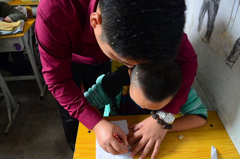 在和這些孩子們的接觸過(guò)程中,我們發(fā)現(xiàn),雖然他們的生活條件不是太好,自身或多或少的有些殘疾,但這些孩子并沒(méi)有我們之前所想象的那樣孤僻,反而是個(gè)個(gè)面帶著燦爛的笑臉,保持著積極樂(lè)觀的生活態(tài)度。這些孩子中有的畫(huà)畫(huà)的很好,有的字寫(xiě)的很漂亮,還有的孩子興高采烈地拉著我的手讓我給他照相……我們所有人都融入到這群孩子當(dāng)中,教給他們寫(xiě)字,和他們一起玩耍、做游戲,而他們也教會(huì)了我們不管生活有多艱苦,都應(yīng)該報(bào)以一顆感恩的心去勇敢地面對(duì)生活。