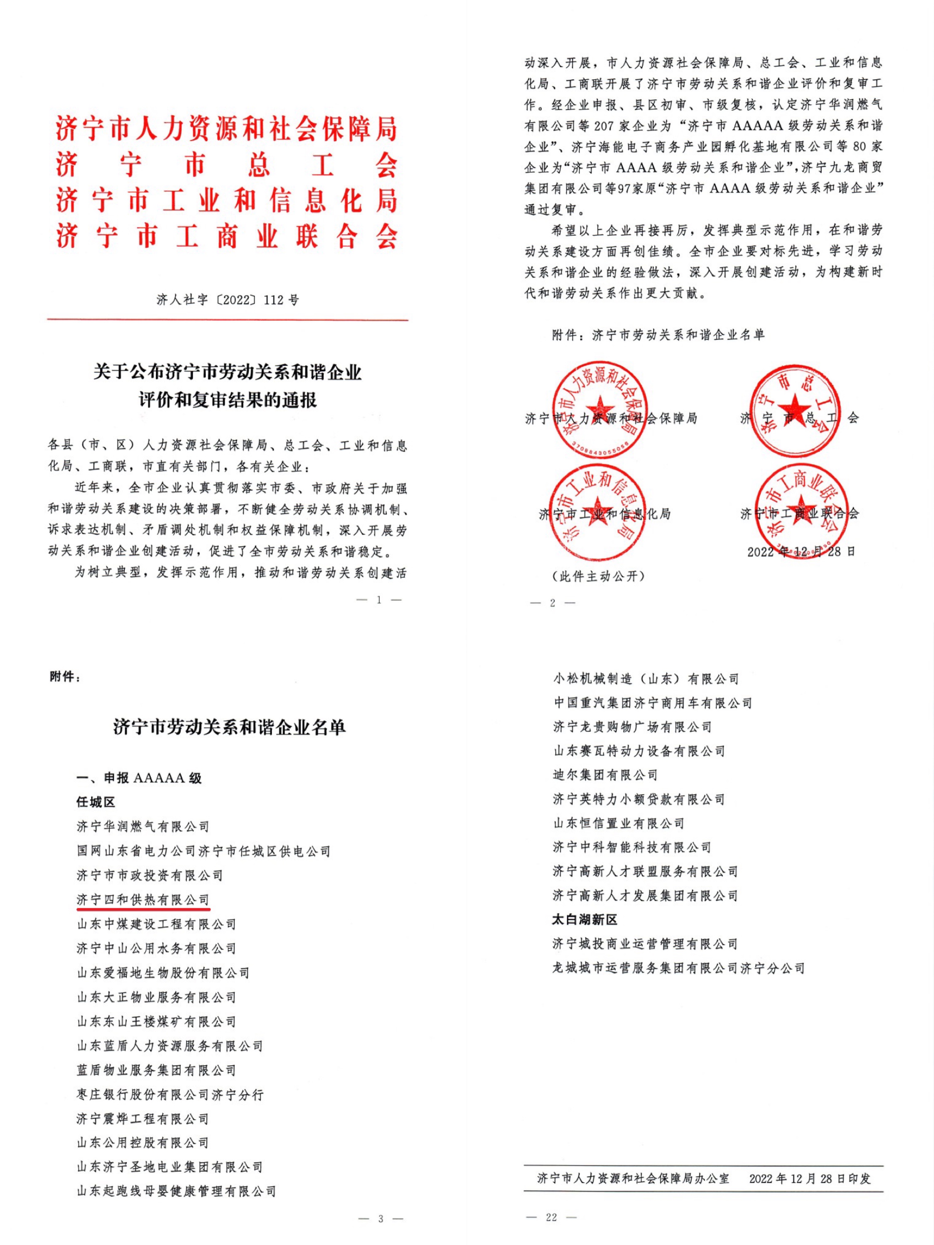 濟(jì)寧四和供熱有限公司 榮獲“AAAAA級(jí)勞動(dòng)關(guān)系和諧企業(yè)”稱號(hào)